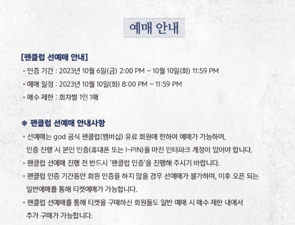 god 콘서트 티켓팅 일정은 10월 10일(화) 선예매를 시작하며 10월 11일(수) 오후 8시부터 본격적인 티켓예매가 시작됩니다.